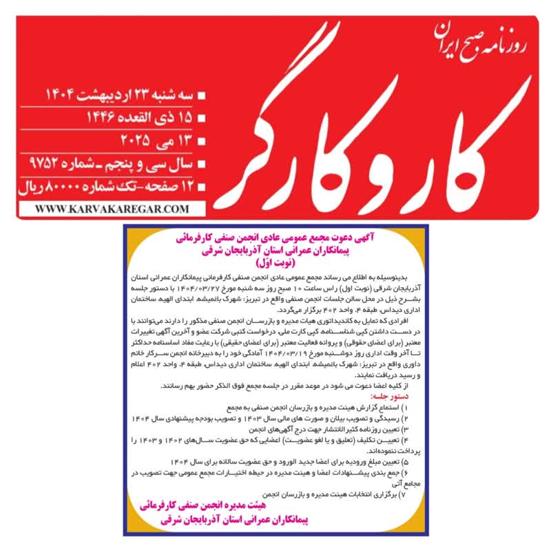 PDFپرینت آگهی دعوت مجمع عمومی عادی انجمن صنفی کارفرمائی پیمانکاران عمرانی آذربایجان شرقی (نوبت اوّل) فایل pdf