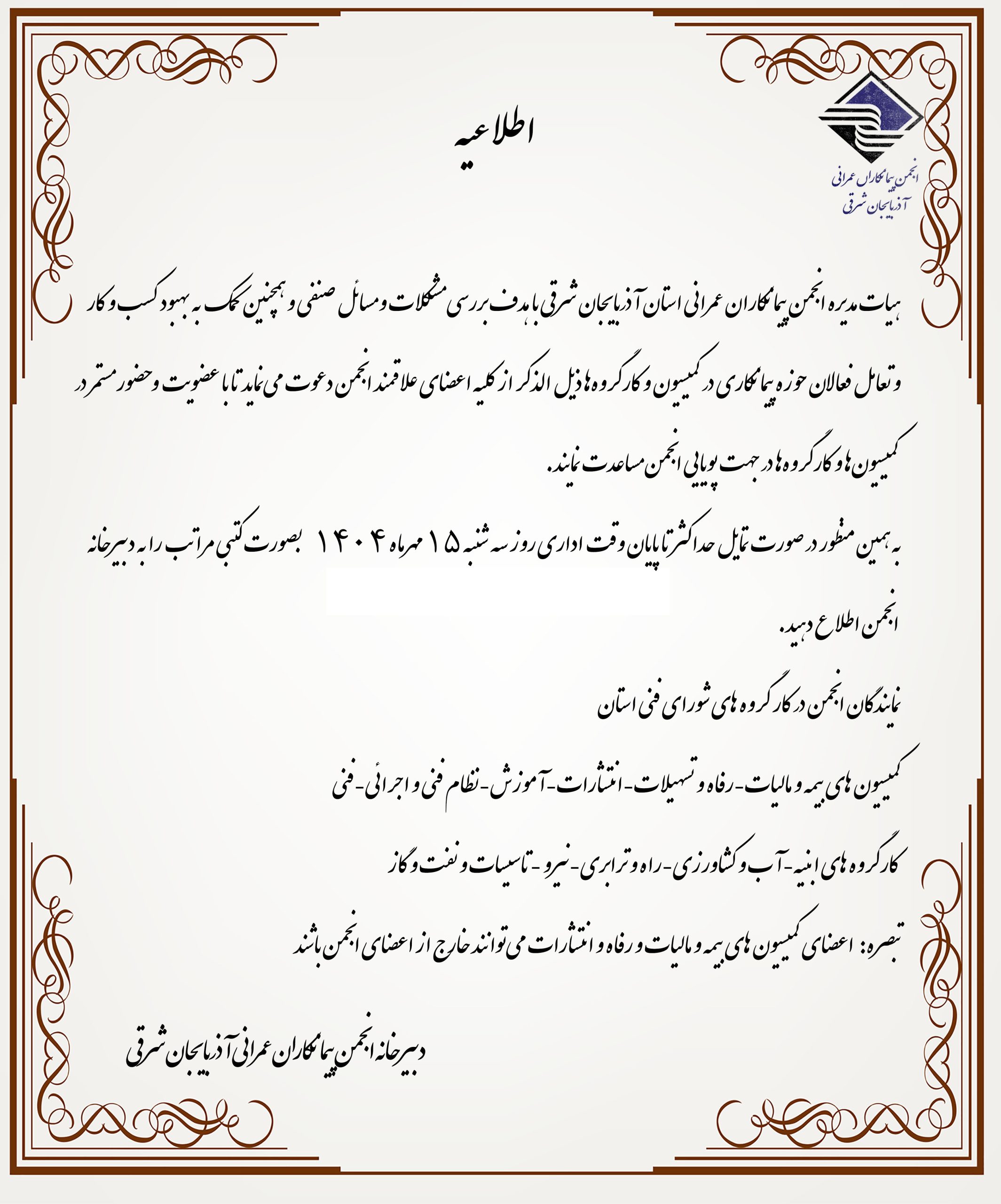 دعوت از کلیه اعضای علاقمند انجمن جهت عضویت و حضور مستمر در کمیسیون ها و کارگروهای ذکر گردیده